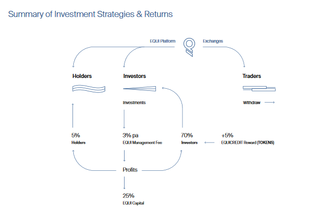 Holders who purchase EQUItokens and keep them on the EQUI platform without investment will receive a 5% profit generated from the realized investment portfolio. It provides tokens held for 3 months prior to distribution.